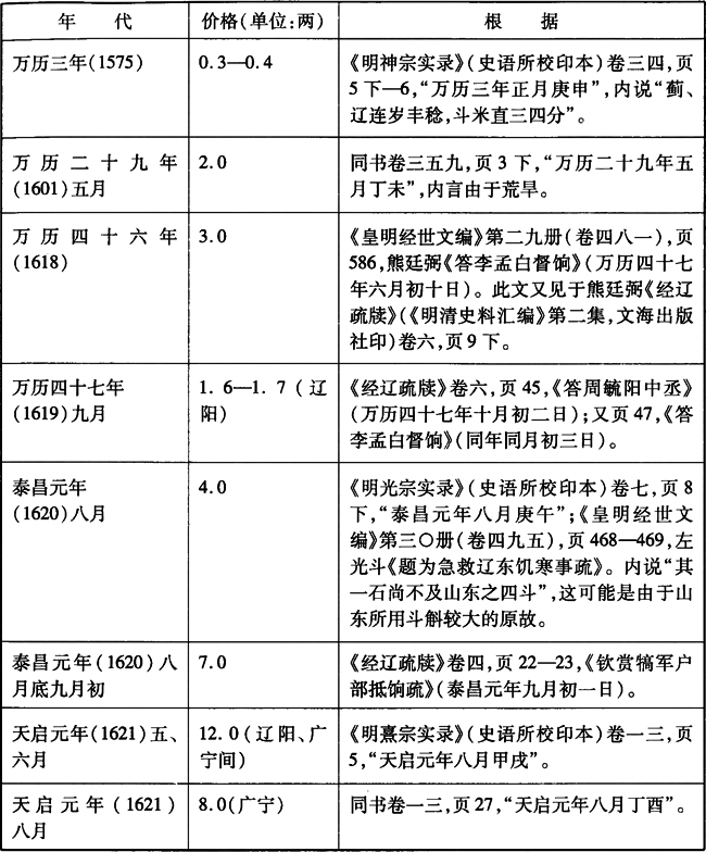 明代辽东人口消费的粮食,除稻米(大米)外,粟(小米)也非常重要。关于明代辽东的粟价,我们也搜集到一些资料,兹列表如下: