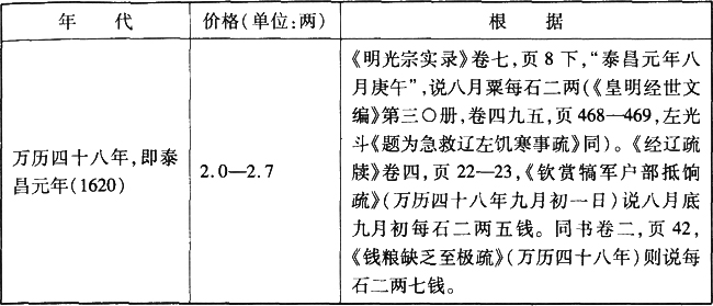 [21] 《明世宗实录》卷一二二,页7下—8,载嘉靖十年(1531)二月丙戌,兵部尚书李承勋说各边镇“平岁米石银一两……凶岁每石值银三两,军多饿死。……”又卷四一二,页3,载嘉靖三十三年(1554)七月癸丑,“户部尚书方钝言:大同镇……岁荒,谷价踊贵,四倍于旧……”。