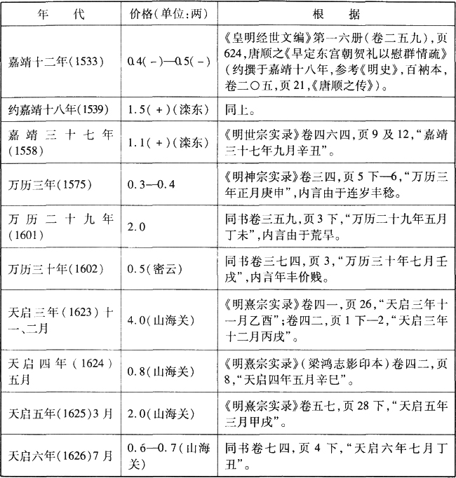 我们看过第四、五两表之后,可知蓟州的米价,在正统十四年(1449)以后的长期间内,虽然不像辽东米价波动得那么厉害,但在嘉靖(1622–1666)中叶前后,及万历(1573—1620)中叶以后,也向上升涨,其后到了天启三年(1623),以山海关米价为例,更涨至每石售银四两,约为15世纪中叶的十三倍有多。