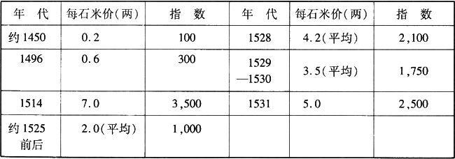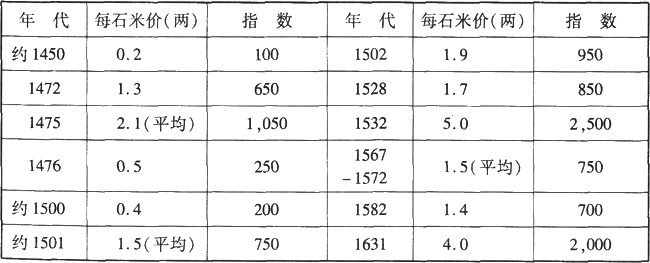 资料来源:见第一表。1450年米价,以1440年米价来代替。