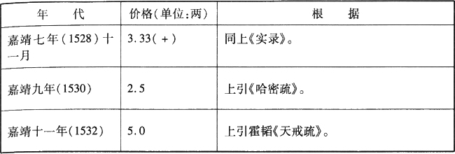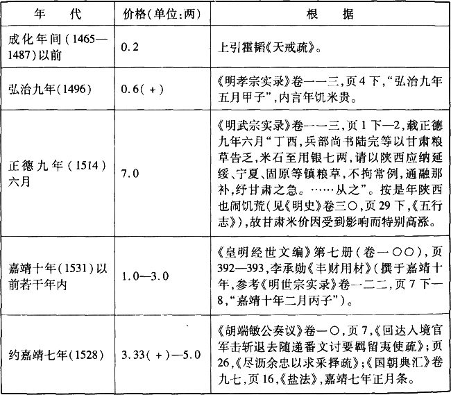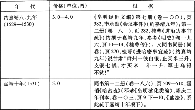 [19]上引唐龙《大虏住套乞请处补正数粮草以济紧急支用疏》(参考第十表“弘治十四年以前”项下)说:“自弘治十四年(1501)大虏占套,(榆林)民废耕种,粟、米、草料等项,俱仰给腹里搬运。银一钱,遇熟籴米八九升,不熟仅籴五六升。”(《皇明经世文编》第二。册,卷三一九,页100,王崇古《陕西岁费军饷疏》略同)。