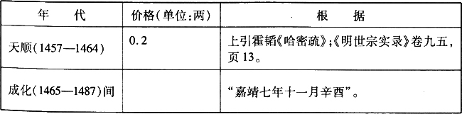 根据以上三表,我们可以知道,明代甘肃米价变动的趋势,除正德九年(1514)特别昂贵以外,和延绥米价非常相似。甘肃的粟价也和米价一样,在15世纪中叶左右比较便宜,及16世纪20、30年代间则向上升涨。