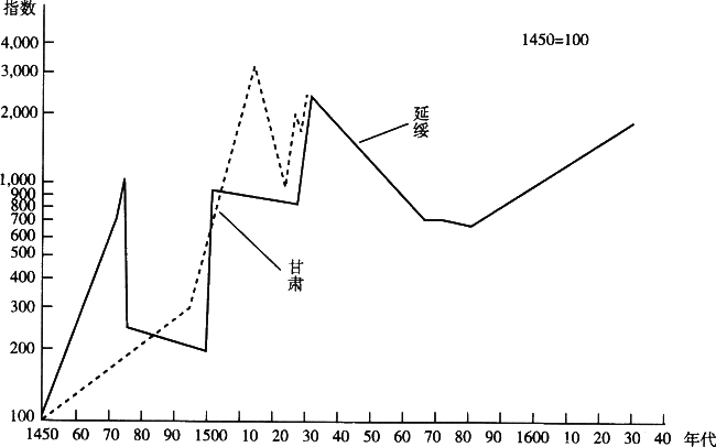 第四个特点是地理上比较接近的边镇,米价升降的趋势大体上都很相似。明帝国北方边境,东起鸭绿江,西抵嘉峪关,因为面积广大,各地米粮的供求状况当然不尽相同,米价的变动当然也不会完全一样。可是,如果把上述各边镇的米价比较一下,我们可以发现,位于北边偏东的辽东与蓟州,米价变动的趋势非常相似,这显然是由于两镇的地理位置比较接近的原故。同样因为地理上的接近,位于长城中部的宣府与大同,米价升降的趋势也很相像。复次,关于明末甘肃米价的资料,我们一时还没有找到,但就嘉靖十年(1531)以前的米价来说,位于长城西部的延绥和甘肃,米价变动的趋势也有若干相似的地方。