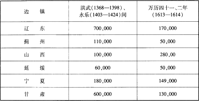 可是,明初政府在北边积极推行的军屯措施,经过相当时期以后,却逐渐废弛。北边田地多半砂瘠,在明朝中叶以前,被分派在那里耕种的屯军,多因劳费大,收获小,赔纳不起定额的屯粮(又称屯粮子粒、屯田子粒、或子粒),而饥困逃亡。[27]其后,到了嘉靖年间(1522–1566),由于边防吃紧,敌兵侵扰,屯政更大受破坏。[28]因此,早在成化十九年(1483),户部郎中毛泰已经说辽东屯粮的实际收入,“岁不足七八万(石)之数,较于旧制,屯田之法,十不及一”。[29]在弘治年间(1488–1505),兵部尚书马文升说:“不知始自何年,屯田政废,册籍无存。”结果屯地“十去其五六,屯田有名无实”。[30]到了嘉靖年间,魏焕说:“今之屯田,十无一存。”[31]又总制陕西三边军务兵部尚书王琼说:“屯田满望,十有九荒,而食不充。”[32]又兵科右给事中祝咏说:“甘肃屯田,名存实废。”[33]及隆庆初年(1567),户部尚书马森说:“屯田十亏七八。”[34]再往后,到了万历四十一、二年(1613—1614),户部尚书叶向高把洪武、永乐间北方边镇每年的屯粮收入,和当年的屯粮收入,加以比较,兹列表如下: