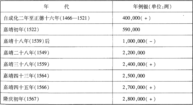 当北边粮食生产因屯田衰落而减小的时候,在那里驻屯的军队,对于粮食的需求却仍然一样;有时因为边境形势紧张,战争爆发,军队加多,对于粮食的需求更要增大。在这种情势之下,政府既然不能倚赖军屯或商屯来供应军粮,为着要维持边军的生活,便不得不运输银子前往接济,称为“年例”,或“年例银”。嘉靖年间,梁材曾撰文说:“正统(1436—1449)、景泰(1450—1456)年间,各边京运年例银两多寡不等,大约不过一十万两之数。”[49]事实上,每岁各边京运年例银十万两的时间,只限于正统年间及景泰初叶,因为景泰三年(1452)户部运往陕西、宣府、大同、辽东籴军饷的银子已达三十万两,[50]景泰七年(1456)则为二十五万五千两。[51]其后到了天顺三年(1459)更多至四十三万两,四年为三十五万五千两。[52]大约初时政府运银赴边,还没有成为定例,但自成化二年(1466)开始,则正式成为岁额或年例。兹将成化二年以后每年自京输往各边的年例银总额,列表如下: