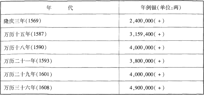 根据以上两表,我们可以看出,自嘉靖初年至万历中叶,即在16世纪的长期间内,政府每年运往北边各镇的年例银,有继续大量增加的趋势。其后到了万历四十六年(1618)四月,努尔哈赤在统一女真诸部族后,以“七大恨”告天,誓师灭明。随着辽东战事的爆发,明朝政府由于军事上的需要,更继续不断地把大量银子运往使用,称曰“辽饷”。例如万历四十七年(1619)八月,吏科等科给事中张延登、官应震等说:“自有辽事迄今一年有奇,而解发该镇者已四百余万。”[55]又泰昌元年(1620)八月,户部奏:“今查(万历)四十六年四月起,至今年七月止,共解过辽东银八百三万八千有奇。”[56]又同年十月“己酉,户部奏:辽东新饷,自万历四十六年闰四月起,至泰昌元年九月止,共发过一千五十一万五千七百二十三两有奇”。[57]其后到了天启元年(1621)正月,“户部尚书李汝华条辽饷之数:自万历四十六年闰四月二十五日起,至泰昌元年十月十七日止,共发银一千九百九十三万二千五百六十两零;自泰昌元年十月十八日起,至十二月二十六日止,共发银二十五万五千八百六十两;总计发银之数,二千□□□(按应作:一十八)万八千三百六十六两”。[58]由此可知,在辽战发生后的两年零八个月内,户部运往辽东的银子已经超过二千万两。除辽东外,如果再加上运往其他边镇的年例银,明季每年在各边支用的银子,为数当然很多。