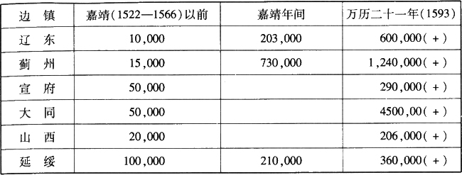 无论是年例银或是辽饷,都是由政府以税收及其他方式自全国各地征集得来,而转运往各边支用的。北边各镇银两开支激增的结果,在市场上对于米粮及其他物品的需求自然增大。可是,有如上述,明中叶后北边米粮的供应却因军屯、商屯的相继衰落而锐减。这样一来,在中叶以后的长期间内,供给减小,需求增大的结果,北方各边镇的米价自然要向上升涨;而万历末年以后的辽东,由于辽饷开支的特别增大,米粮及其他物品的价格自然要更加昂贵了。