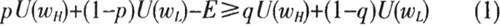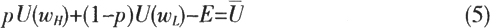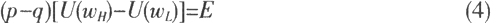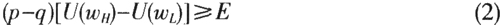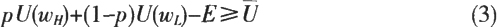 ,产出为Q,Q可以取两个值:“高”(H)和“低”(L),这两个产出以一定的概率实现,其中,高产出又与佃农的努力程度有关。同理我们假设佃农的努力程度为e,e可以取两个值:e=l(努力)和e=O(不努力),当佃农努力时,高产出的概率为p,而当佃农不努力时,高产出的概率为q,p>q。当然,佃农付出高努力是有成本的,我们用E来表示成本,而佃农不努力时的成本为O。假设w是佃农获得的货币支付,那么其效用函数可以表示为U=U(w),U(·)是严格递增且凹的函数。为了使模型更加合理,我们进一步假设佃农的努力程度是私人信息,即是不可观测的,并且佃农是厌恶风险的。我们首先假设地主试图设计一个契约来诱使佃农选择e=1,然后再来看佃农可以通过什么途径来达到这个目标。契约规定WH为高产出时的工资,毗为低产出时的工资,其他不变。那么,相应的激励约束可以表示为: