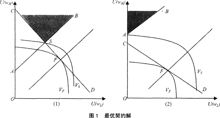 ,在这里,参与约束不起作用,只有激励约束起作用,很明显,地主的均衡点时角点A,它的经济学意义是如此明显:“好”状态下支付OA;“坏”状态下支付O。这是租佃契约理论中一个极端的例子,当情况不好时,地主拒绝支付任何报酬。仔细观察(2),我们可以发现另一个极端情况,即激励约束不起作用,只有参与约束起作用。这实际上就是最优契约所表达的思想f努力程度可以被观测l。因此,在努力可以被观测的情况下的地主的均衡点为F(45°线与效用曲线VF的交点)。由于F点也位于45°线上,因此在这一点上,“好”、“坏”状态下均提供相同的效用