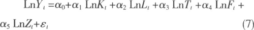 在(6)中,K表示在农业生产过程中机械设备投入的总动力;L表示农业生产中劳动力的总投入量;T表示农业生产中可用的耕地总面积;F表示农业生产中化肥施用总量;Z可以用于表征其他一些影响农业生产绩效的制度变量。