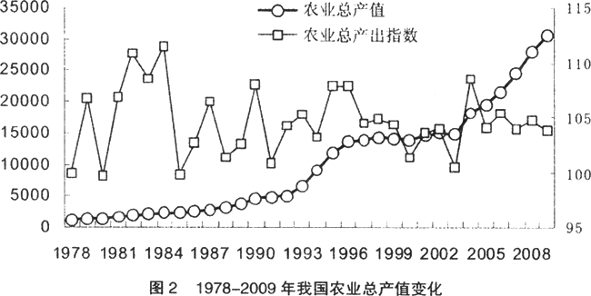 图2显示了我国在1978—2009年期间农业总产值变化趋势。从中不难看出,我国农业总产出从整体上看始终处于增长的趋势,其中在1992—1996年期间和2003—2009年期间分别出现了一段时间的高增长,当然这种高增长包含了价格因素。从农业总产值指数中不难看出,农业的增长速度一直保持着比较平稳的速度,其中出现负增长的仅有两个年份:1980年和1985年。而农业产出增长最快且达到两位数增长速度的是在1984年【4】。从1978—2009年期间,农业总产出年均增长速度为4.62%。