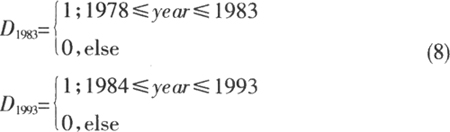 根据前述的研究,目前很难找到一个合适的代理变量来表征这三个阶段的不同制度性特征,只能够采用虚拟变量的方式来解决这个问题。按照虚拟变量设置的规范,如果有N种状态,只需要设置N-1个虚拟变量就能够准确体现这种区别。因此,本文在研究过程中,将1978年至今的这段时间,按照农村土地契约制度的主要变化划分为三个时期,设置了两个虚拟变量