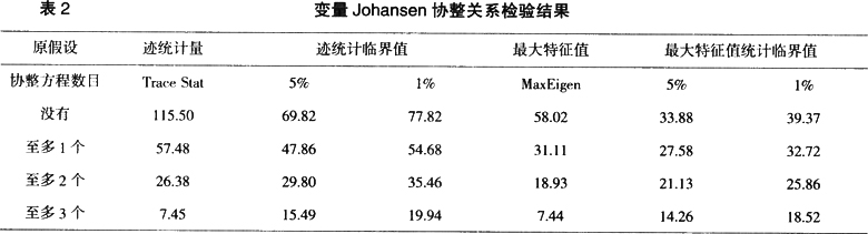 恩格尔和格兰杰(Engel and Grange,1987)指出,两个或者多个不平稳的时间序列变量的线性组合可以是平稳的,也就是说它们之间可以存在协整关系。一般用于判断协整关系的方法主要有两种:一种是Engel和Granger提出的两步法E-G检验,另外一种是乔翰森(Johansen,1995)提出的基于VAR的协整关系的检验。前者需要先进行变量回归,再对残差进行检验,且多用于两个变量之间的协整关系检验。而后者可以适用于多个变量之间的协整关系检验。因此本文采用Johansen协整关系检验。而Johansen协整关系检验主要包括两个统计量,一个是迹统计量(Trace Statistic),还有一个是最大特征值统计量(Maximum EigenvMue)。对多个变量之间是否存在长期协整关系需要结合这两个统计量的检验结果同时综合分析。我们对本文研究所需的四个变量之间协整关系检验结果如表2所示。