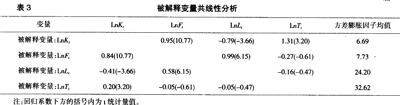 从表3对四个主要被解释变量的回归分析中不难看出,解释变量之间大多都存在严重的相关性,其中以LnK1与其他解释变量之间的共线性程度最为严重。再来看每一个回归中的方差膨胀因子均值,不难发现所有的方差膨胀因子都大于5。这两个检验方法无一不说明在(7)式所对应的回归模型中存在严重的多重共线性现象。