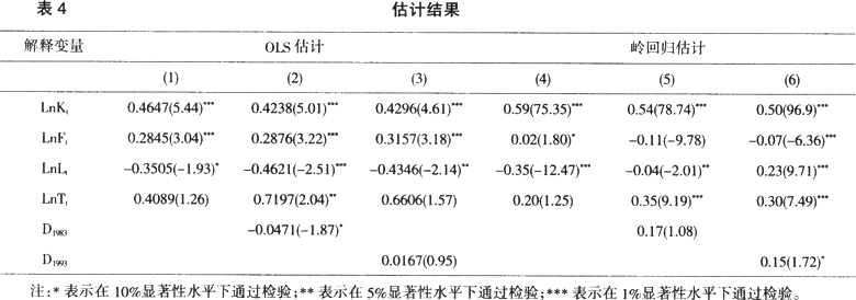 本文同时使用OLS估计方法和岭回归估计方法对(7)式所对应的模型进行估计,得到的估计结果如表4所示。