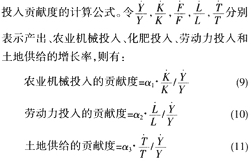为了更为准确的获得不同要素投入和制度因素对1978—2009年期间农业生产绩效的贡献度,我们采用份额法对(7)式进行变形可以得到不同要素