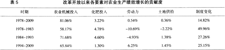 表5的回归结果正如我们前面所分析的。1978—1983年,制度因素贡献率高达49.96%,也就是说,1978—1983年的中国农业发展完全得益于家庭承包制。而从1993年以后,制度因素的贡献率反而下降,为25.15%。也就是说,延长承包期限的做法对于农业的长期增长事实上是贡献很小的。这也就验证了我们前面所有的理论分析,对于任何形式的土地租佃契约来说,如果要提供保险,就不可能实现完全效率,土地租佃契约本身就是缺乏效率的。对于表5进一步观察,我们发现,中国的农业的长期增长,化肥投入、劳动力和土地供给的贡献率始终是不显著的。那么,表5的估计结果隐含的政策建议就是如此明显:既然延长承包期限对农业增长的贡献不大,未来的农业改革就应该强调土地的所有权的流转,鼓励小农场生产方式,并通过其他的制度安排来完善农业机械化生产。