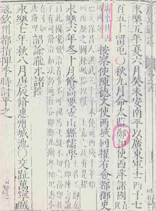 在嘉靖十四年广东巡抚戴璟所编《广东通志初稿》有一条相关史料。该书卷十一《循吏传》说,永乐十九年,王询任韶州推官,“时内臣赍金币劳赐海外诸蕃国,护行军官颇横,径捕韶民三人偕之往,家人号呼,以金赎之,不许。询至其舟中,夺之以归。”