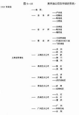 美孚石油公司是美国石油业的垄断组织,也是国际上最大的石油托拉斯之一,属洛克菲勒财团。1870年由约·戴·洛克菲勒(John Davison Rockeffeller)创办。最初它的油输入中国,还是委托外商洋行经手转售给华商。1894年美孚在中国设立办事处,1906年开始与华商建立经销关系,实行直接推销制。旋建总公司于上海(亦称总管理处),并逐步在上海、南京、天津、青岛、汉口、广州设立6个区分公司,在苏州、杭州、九江、长沙等中等城市设立20来个公司,形成一套几乎遍布全国的直属推销机构,其组织系统略如图5—15。