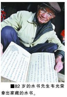 韦光荣家原有200多册水书,除捐给档案馆、赠给学者研究外,留下几十本家用。事实上,大多数水书先生家藏书寥寥,远不如韦家这么丰富。“文化大革命”期间,水书被定为“牛鬼蛇神”,大量水书遭没收销毁,被迫藏于田间山洞的水书,很多遭水渍、虫噬而腐烂,保存下来的极少。韦光荣家的200多本水书,藏在干栏楼底层顶棚上,才幸免一劫。