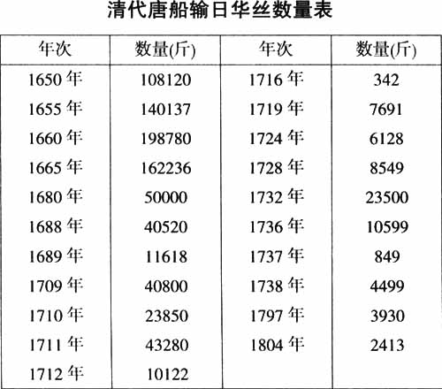 上表表明,进入康熙时期,唐船输日华丝的数量虽然不是直线下降,但不断下降的趋势却十分明显,到临近康熙开海,已大体上不到前此的三分之一。开海后,唐船数量激增,输日生丝却大减。到乾隆年间后,输日华丝更是微乎其微,乾隆三十二年、三十七年、三十八年、四十二年、五十年5个年头则全然没有输入。