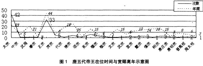 唐五代史籍中,帝王赏赐高龄老人的记载连篇累牍。笔者将新旧《唐书》、《册府元龟》及《全唐文》等书中赏赐高年的记载进行汇总,制成“唐五代帝王赏赐高年表”,[28]153-156并据此制成“唐五代帝王在位时间与赏赐高年示意图”(图1)。