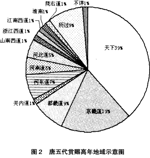 从以上情况来看,唐五代政府对高年的赏赐首先集中在京都地区。主要原因是该地区为国家的政治、经济、文化及军事中心,朝廷将安抚这一地区的民心放在首位,借赏赐高年等政治行为以维护京都地区的稳定;另外,古代帝王出行必有恤赏,京都地区是皇帝行幸和巡狩的近便之地,这也造成了皇帝对该地区的高年赏赐较多;其次是环卫京都的河东、河南等地区。特别是晚唐,河东、河南道是防范河北叛镇的重要屏障,也是唐代重要的经济区域,因此,中央对这些地区非常重视,这在对该地区高年的赏赐问题上也表现得比较明显;再次是对河北道叛镇的赏赐。这是唐王朝为了安抚、招降河北叛镇,对归附中央的藩镇及时进行赏赐,借以达到招抚其他叛镇的目的;赏赐最少的是关内道、山南西道、浙江西道、江南西道、淮南道、陇右道等。除了记载不充分的因素外,从地域上讲,这些地区距离中央均比较远,因此,对这些地区高年的赏赐也就比较少。