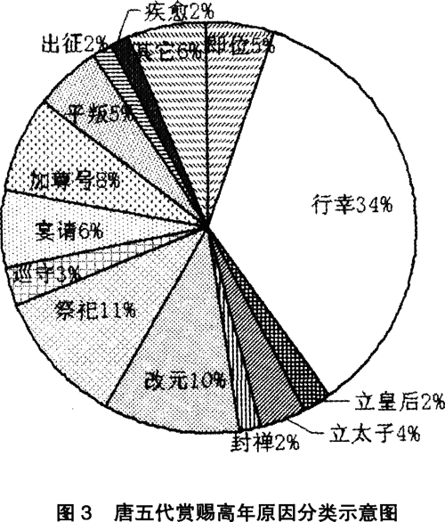 下页图3显示,在赏赐高年的原因中,以行幸①所占的比例最高,达34%,集中体现了统治者养老措施中“行则就见”的一面;此外,祭祀②11%,改元10%,加尊号8%,宴请6%,即位5%,平叛5%,立太子4%,巡狩3%,封禅、疾愈、立皇后、出征各占2%,还有6%为其他。③从总的情况来看,赏赐高年与帝王直接参与的国家的重大政治活动有着密切联系。如行幸是皇帝亲临百姓的一种象征,即所谓的体察民情,故皇帝在行幸之时往往要对当地高年等进行赏赐,以显示皇恩浩大。而皇帝即位、祭祀、加尊号、改元都是古代社会帝王的重要政治活动,期间,在位皇帝对高年等特殊人群进行赏赐,旨在扩大这些活动的影响,以提高个人威望。封禅、立太子、册封皇后、疾愈等,是国家喜庆的大事,此时往往大赦天下,同时实施赏赐高年等“惠政”,以示举国欢庆,与民同乐。此外,每逢平叛、出征等国家的重大政治活动,帝王对高年等进行赏赐,是为了安抚叛镇,招揽民心,以巩固自己的统治。