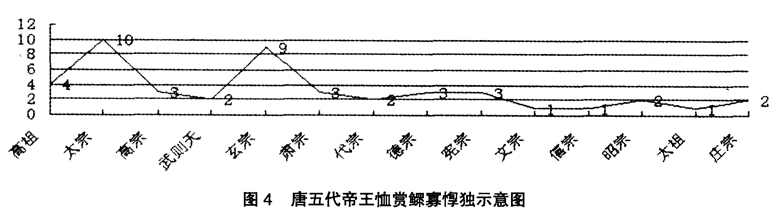 这些统计显然不可能是唐五代时期政府赏赐高年的全部,分布情况也未必能全面真实地反映当时的实际。但从图1我们仍然可以看出,唐五代帝王赏赐高年的行为存在如下特点:(1)在唐五代总共343年中,共计赏赐高年140次。唐玄宗以前的137年中,共赏赐101次,占总数的72%;唐后期至五代204年,仅赏赐39次,占总数的28%。无论从唐五代这个大的历史时段看,还是就某个帝王在位的时期看,都明显表现出前期多后期少的特点;(2)从图中可以看到太宗、玄宗、高宗三朝赏赐数最高,凡96次,占赏赐总数的69%。这三朝也是唐代最为清明的时期,三朝累计100年,几乎每年赏赐一次。可见,对高年的赏赐与政治的清明及政府的财政状况紧密相关。