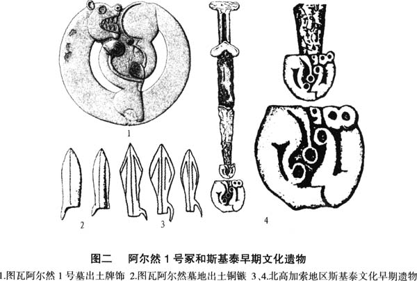 米努辛斯克盆地东南部的图瓦地区的阿尔然1号冢可视为这个阶段牧业发展、社会分化的典型代表。此墓规模宏大,石头筑起的封堆直径达120米,巨大圆木在地面上构筑的墓室由70个放射状排列的木格子构成。中央墓室埋葬着首领和他的亲密伴侣,其他墓室则是从属部落代表的遗物,可能还有友好部落的贡物。约有160匹配鞍鞯的马埋在古冢里,另有约300匹马在葬礼中被吃掉。最初认为其时代为公元前8世纪至前7世纪,后又确定为公元前7世纪,晚于斯基泰出现在北高加索地区的时间【24】。但俄罗斯专家最新的测年结果是公元前9世纪末至前8世纪早期【25】,这个年代可能更接近墓葬的始建年代。由于墓葬反映的很多风俗和斯基泰的很相似,早有学者推测墓主人可能是斯基泰人的祖先【26】。本文并不认为图瓦地区公元前8世纪以前的墓葬属于斯基泰人祖先。阿尔然1号冢的墓葬形制和出土器物确有一些因素在斯基泰早期的文化中延续,比如铜镞、蜷曲状动物形象等(下页图二)。哈萨克斯坦北部和黑海北岸地区也发现了类似的向心状的墓葬【27】。但本文认为阿尔然1号冢属于三道海子文化遗存。从新疆和哈萨克斯坦发现的大量三道海子文化遗存的器物看,图瓦、阿尔泰至天山地区的文化似在公元前8世纪至前7世纪曾通过阿尔泰和新疆大规模进入到中亚草原地区,这或与前述独目人扩张有关【28】。斯基泰文化有很多类似阿尔然1号冢的因素说明三道海子文化遗存可能深刻影响了西迁以前的斯基泰人。