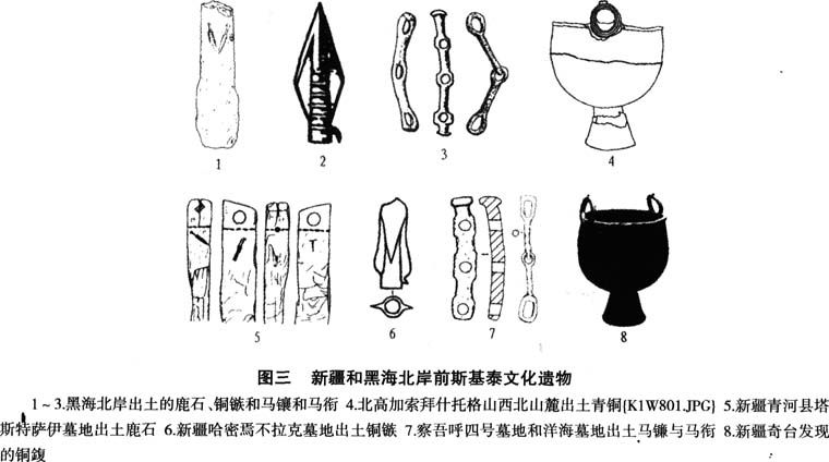 考古发现证实了《历史》对斯基泰人使用青铜鳆的记载。不过斯基泰人大量使用青铜鳆始于公元前6世纪。器耳有圆雕的食草类动物和带三个乳突的直立环耳两类【40】。此前,只有黑海东岸库班草原的克莱门兹斯基泰早期墓葬出土一件青铜鍑,时间为公元前7世纪末,和拜什托格式铜鳆相差近百年,式样也有很大变化,口沿上为羊的圆雕。所以,斯基泰人使用青铜鳆的样式应当直接来自中亚哈萨克斯坦草原的某处或非常间接地受拜什托格式铜鍑,甚至乌拉尔图和希腊文化的影响。公元前8世纪至前7世纪,新疆早期铜鍑的样式突然出现在北高加索地区,说明三道海子文化遗存和北高加索地区可能存在联系。早期牧业文化的交流使东方的箭镞、鹿石和铜鍑等传播到北高加索地区,欧亚草原东西方的物质和信息交流在这一时期是畅通的,这是后来斯基泰人西迁的基础【41】。