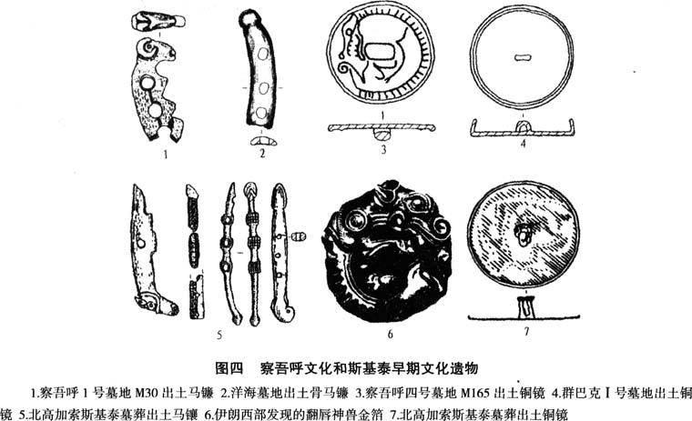 伊朗西北部齐维耶宝藏一般被认为是斯基泰人的遗物,时代约为公元前600年。其中的蜷曲状野兽纹金箔显然仿自东方的类似器物(图四,6),类似的动物风格艺术在斯基泰文化中有若干发现。年代更早的新疆察吾呼四号墓地M165出土1件铜镜,背面有蜷曲的神兽形象,上唇翻卷明显,或为狼或者虎形神兽(图四,3)。该发现可视为中原和伊朗西北齐维耶发现的中间环节,是斯基泰人来自东方的证据之一【46】。圆形带钮铜镜是在新疆、甘青地区发展起来的铜镜类型,成为后来中原铜镜的主要形式【47】。公元前9世纪,圆形带钮镜出现的背面边缘明显起折的新类型,在阿尔泰周围的牧业地区很流行,哈萨克斯坦和新疆的早期文化中都有发现(图四,4)【48】。北高加索地区斯基泰早期文化中发现的这种折沿铜镜应当是从新疆及其周围地区传入(图四,7)【49】。