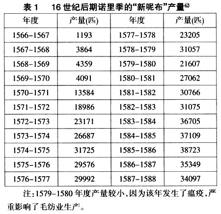诺里季市政当局曾主动要求王国政府许可外来移民定居,称该城因此而“获得了极大好处”。(59)该城的“新呢布”生产最为成功。表1显示,1574-1575年度诺里季的“新呢布”产量,是八年前的26倍,以后大致维持在3万匹左右。(60)“新呢布”生产使诺里季的财富出现了跳跃式增长,税收也比以前增加了两倍多。(61)