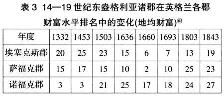 然而在现代经济中,农业创造的财富指数远低于工商业,因此诺福克、萨福克及埃塞克斯这几个财富水平(地均财富)曾经领先的郡,19世纪却靠后了(见表3)。此外,由于商品化农业所需劳动力减少,东盎格利亚农村出现了大量剩余劳动力。而本地工商业发展趋缓,城市吸纳力有限,不能消化这些剩余人口,因此他们便向外迁移,流向伦敦和约克郡西区、兰开夏等工商地区,由此造成东盎格利亚地区人口减少。从1701年至1751年,诺福克郡人口达37517人;萨福克郡人口向外迁移达14275人。(111)该地区的城市发展也进入沉寂时期,城镇只成了这一农业区的物资和人口集散中心地而已。
