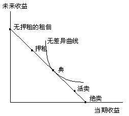 土地的每一个权利都代表一定的价值。正是因为土地物权的不同层次可以在多样化的交易中实现分割,当期收益和未来收益也可以实现调剂,人们对资金的多样化需求得以被更充分的满足。图2体现的是不同形式的地权交易对当期收益和未来收益的权衡。且在图中的无差异曲线所显示的偏好中,典这种交易是交易人最优的安排。