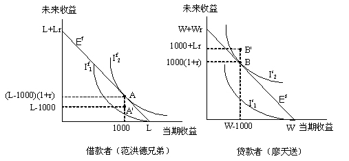 范洪德兄弟1896年时曾以土地3年的地租胎借了1000元,每年地租60石为借款利息。设该土地的价值为L,市场上资本三年的总利率为r。若将这个交易简化成两期的收益安排,即借款时为当期,三年后为第二期,假设投资土地的回报率(地租与地价的比率)等于资本的市场利率r,即地租为Lr。范洪德兄弟和廖天送的收益可能性曲线在下图中分别为E和E’。范洪德兄弟可以选择当期将土地出卖,获得收益L,或三年后将土地出卖,获得收益L+Lr。若其可以将土地资产进行自由随意的拆分,并且拆分后的每一部分都可以进行买卖和投资,且任何无风险投资的回报率都相等,范洪德兄弟的收益可能性曲线(即消费的可能性曲线)如上文所述为:R1+R2/(1+r)=L。设廖天送现在的财富为W,若其可以自由选择将其财富的一部分或全部进行投资,三年后获得投资收益。其收益可能性曲线为R1+R2/(1+r)=W。