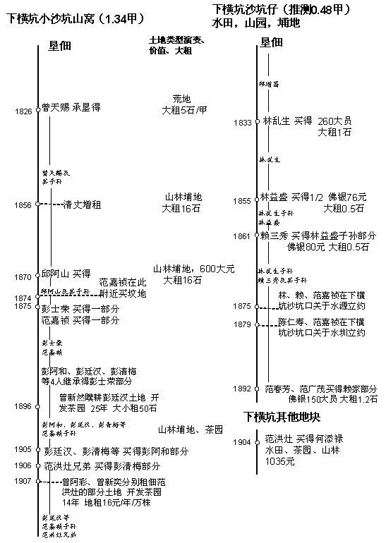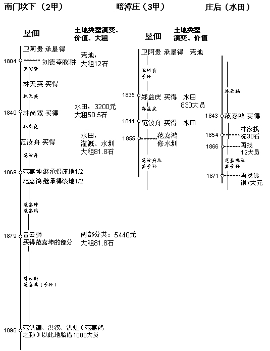 增值收益权甚至可以由后代继承。表2显示了林云福将土地卖给范嘉鸿的例子。从活卖交易发生,到林云福的后代最后一次找洗经历了28年,这期间该地区的地价整体有所增长。如南门坎下的二甲水田的价格由1840年的3200元涨到了1879年的5440元(见附图1);下横坑沙坑仔的半甲田在1855年到1861年期间由76元涨到80元(见附图3)。
