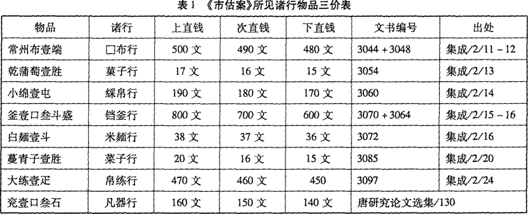 【40】池田温指出,“市估是根据从各个交易价格抽象出来的时价决定的公定市价,所以在理论上它应该代表时价,并且在原则上应和时价一致。然而,由于各种复杂因素的作用,市估事实上往往不能正确反映时价。……通观三等估价,其记载整齐划一,看得出是有意做成这样的。例如药行数十种品目,上次下三等差价的差价各是一文。如果反映实际的质量差别或者交易差价,就不可能出现这种情况”。应当看到,《市估案)对市场物价的评估,既不是市场物价的记录,更不是店家的明码标价。市场价格变动大,档次也不一定是三等,或九等,级差也不会那么整齐。所以,市场上物品价格的实际情况可能还要更复杂一些。参见《唐研究论文选集》,第151页、第153页。