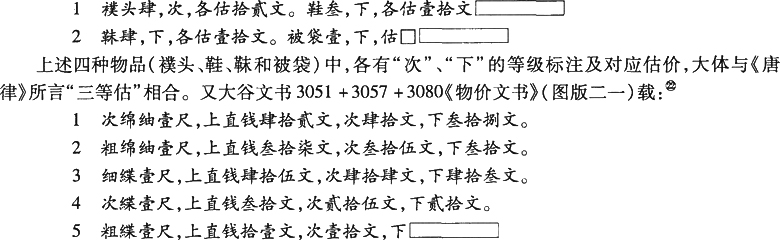 可见,唐代西州市场中,绵纳和緤就其质量而言有细、次、粗三等,每等又有上、次、下三种价格,因而对于同类物品绵纳和鲽而言事实上形成了三等九价。日本《令义解》关市令“每肆立标”条:“凡市,每肆立标,题行名,市司准货物时价,为三等。十日为一簿,在市案记,季别各申本司。”其中“三等”,其下注目:“谓准货物时价者,凡物各有上、中、下三品,即其价值,亦物别各有上中下三等,故总有九等沽价,即下条云准中沽价,文云准货物价,即知据市廛交关之价,官不别立沽价法也。”【23】日本学者仁井田陞据此指出,市场上的货物并不限于分为三等,三等中各有上、中、下价格,每种货物就都有九等价格。【24】同样的材料还见于羽田氏藏829号《市估案》中:“细鞋壹量,上直钱柒拾文,次陆拾文,下伍拾文;次鞋壹量,上直钱伍拾伍文,次伍拾文,下肆拾伍文。”【25】这里细鞋、次鞋各有上、次、下三种价格,至于粗鞋的三种估价虽然已残,但不难推知此鞋有细、次、粗三等,每等又有上、次、下三价,从而形成了九种价格。