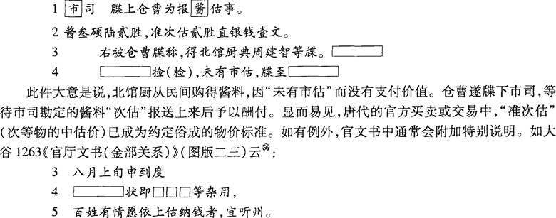 牒文中的“上中二旬柴估”即市司分别于十一月上旬和中旬主持的两次{艹刺}柴价的评估,这与唐令“每月旬别三等估”规定正相符合。按照唐代上、中、下的三等估价,第9行“准次估”即次等物的中估价。如《唐令》所言:“诸官与私交关,以物为价者,准中估价,即悬平赃物者亦如之。”即言官府与百姓以“中估价”达成双方交易。大谷1422号《北馆文书(得市司牒酱估直(银钱)牒》:“右得市司牒称,上件酱二升,准次估直银钱一文者,依检案内,件主如前。”【54】表明酱估亦按“次估”即次等物的中估价来核算。同样的材料还见于大谷1032《北馆文书》(图版一○)中:【55】