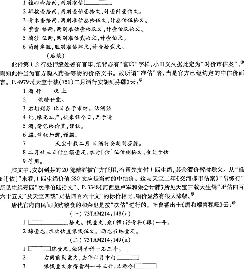 【3】[日]仁井田陞:《吐鲁番出土的唐代交易法文书》,[日]周藤吉之等著、那向芹译《敦煌学译文集——敦煌吐鲁番出土社会经济文书研究》,甘肃人民出版社1985年版,第660—740页;[日]池田温:《中国古代物价初探——关于天宝二年交河郡市估案断片》,《唐研究论文选集》,中国社会科学出版社1999年版,第122—189页;王仲荦:《高昌物价考》,《金泥玉屑丛考》,中华书局,1996年版,第l97—214页;卢向前:《唐代前期市估法研究》,中国敦煌吐鲁番学会编《敦煌吐鲁番学研究论文集》,汉语大词典出版社1991年版,第693—714页;李锦绣:《唐代财政史稿》上卷,北京大学出版社1995年版,第215—225页;张泽咸:《唐代工商业》,中国社会科学出版社1995年版,第358—366页;李维才:《唐代物价制定及其作用》,《唐都学刊》2007年第2期,第35—39页。
