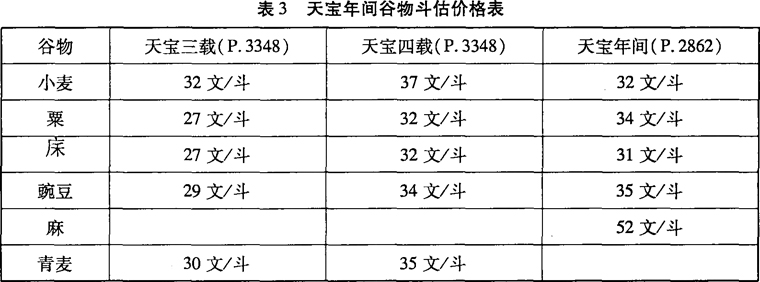 据前引《唐五谷时估送尚书省案卷》所见“五谷时价以状录申,尚书省户部听裁”、“粟时估解一条并目”、“粟时估”、“时估录申中台司元”、“米粟时估以状录申东”等信息,可知“五谷时价”即五谷时估,也就是中估价。P.3348《河西豆卢军和籴会计牒》收有天宝三载至四载小麦、青麦、粟、和豌豆的斗估价(参见表3)。据牒文“去载冬季军仓支粮帐,经支度勾,并牒上金部比部度支讫”及多次出现的“准和籴估”、“准估”、“斗估”、“疋估”等信息,可知“准估”为官定的中估价。又 P.3348背《天宝六载(747)十一月河西豆卢军军仓收纳籴粟牒》第17行:“行客任愆子粟壹伯捌拾陆,估廿一文。”【63】与天宝四载的物价相比,粟价斗估下降了11文。由此看来,天宝年间除粟的估价有很大波动外,其他谷物的价格大致变化不大,总体比较稳定(参见表3)。