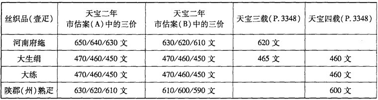 【60】如果将《天宝二年市估案》(A)、(B)中的丝织品如河南府絁、大生绢、大练及陕州純与P.3348《河西豆卢军和籴会计牒》多见的对应物品加以对比,P.3348中的丝织品价格大致与《市估案》(B)对应物品的中估价等同。具体情况参见下表: