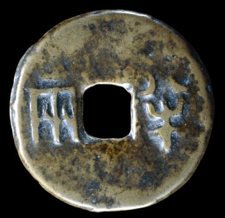 在这枚钱币上刻有“半两”二字,“半”在洞的右边,“两”在左边。半两意为半盎司,是钱币的重量。