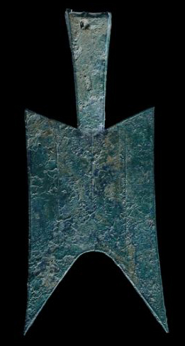 这枚中国早期的铲形钱币形似铲,其首中空,耸肩,尖足。早期的中国铲形币取相真实工具的形状。铲形钱币和铲具都是浇铸到模具中制作的,但钱币通常较小,所需的金属比铲具薄。为了解决关于铲形钱币在中国发展的争论,科学家们近来已经分析了铲具和最早的铲形钱币的金属成分。他们发现用来制作铲形钱币的金属与制作铲具的金属有很大的区别。