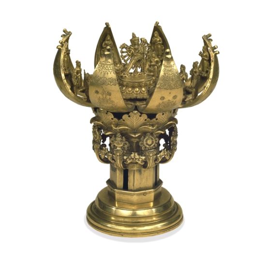 这件精致的青铜曼荼罗是汉藏风格的物品。清朝时期在中国制造,但呈现的却是藏传佛教的元素。这件铸造品就如同一朵石榴花,与莲花样式的印度铸造品有点相似。