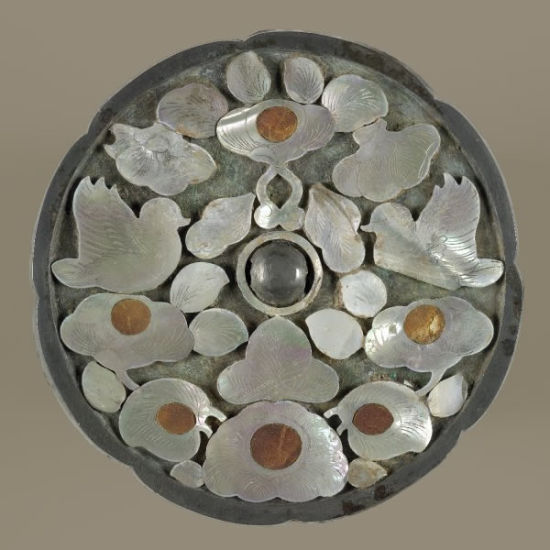 10.珍珠母嵌花青铜镜 来自中国,唐朝,公元8-9世纪。