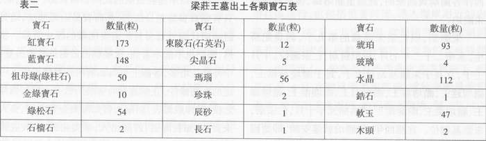 二是大量出土遗物来自海外。粗略计算,所有随葬品使用大量金银珠宝,其中金16000克,银13000克,玉14000克,各种宝石700多颗。世界五大名宝中,除钻石外,其它名实在梁庄王墓都有发现(见表二),而且不乏精品。例如蓝宝石中有蓝色极优的品种,有金色的品种,有些大粒蓝宝石重量近200克拉;金绿石多具猫眼效应,有些红宝石、蓝宝石具有星光效应。