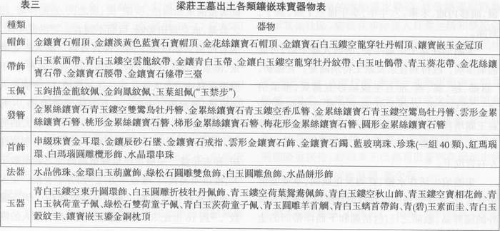 2005年9月30日至2006年1月2日,梁庄王墓出土文物精品在广东省博物馆展出,展品中镶嵌各种珍宝的文物比比皆是(见表三)。当然,需要指出,这些宝物并不一定全部来自海外。