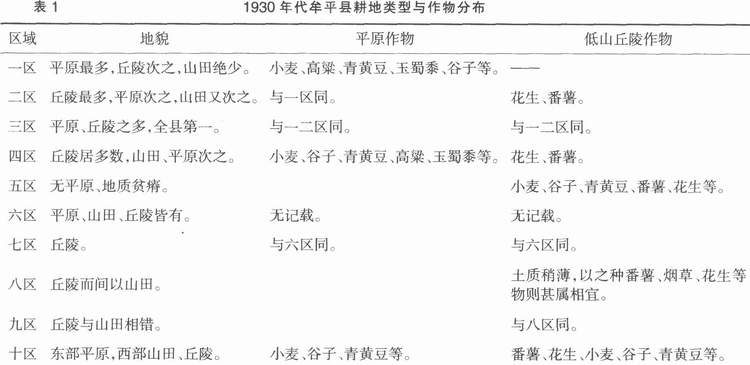 胶州南部和北部的自然环境相异,因而作物种类也不尽相同。在南部地区,低山丘陵区适合花生种植,故其产量颇大。与之不同的是,在北部平原区,虽然土地较为肥沃,但是花生播种面积却很小。事实上,在那些岗岭起伏,山区、丘陵、平原等各种地貌盘垣交错的县份,花生也有自己的分布特点。本节以牟平县为例分析之。表1列出了1930年代牟平县的耕地类型与作物分布的情况。